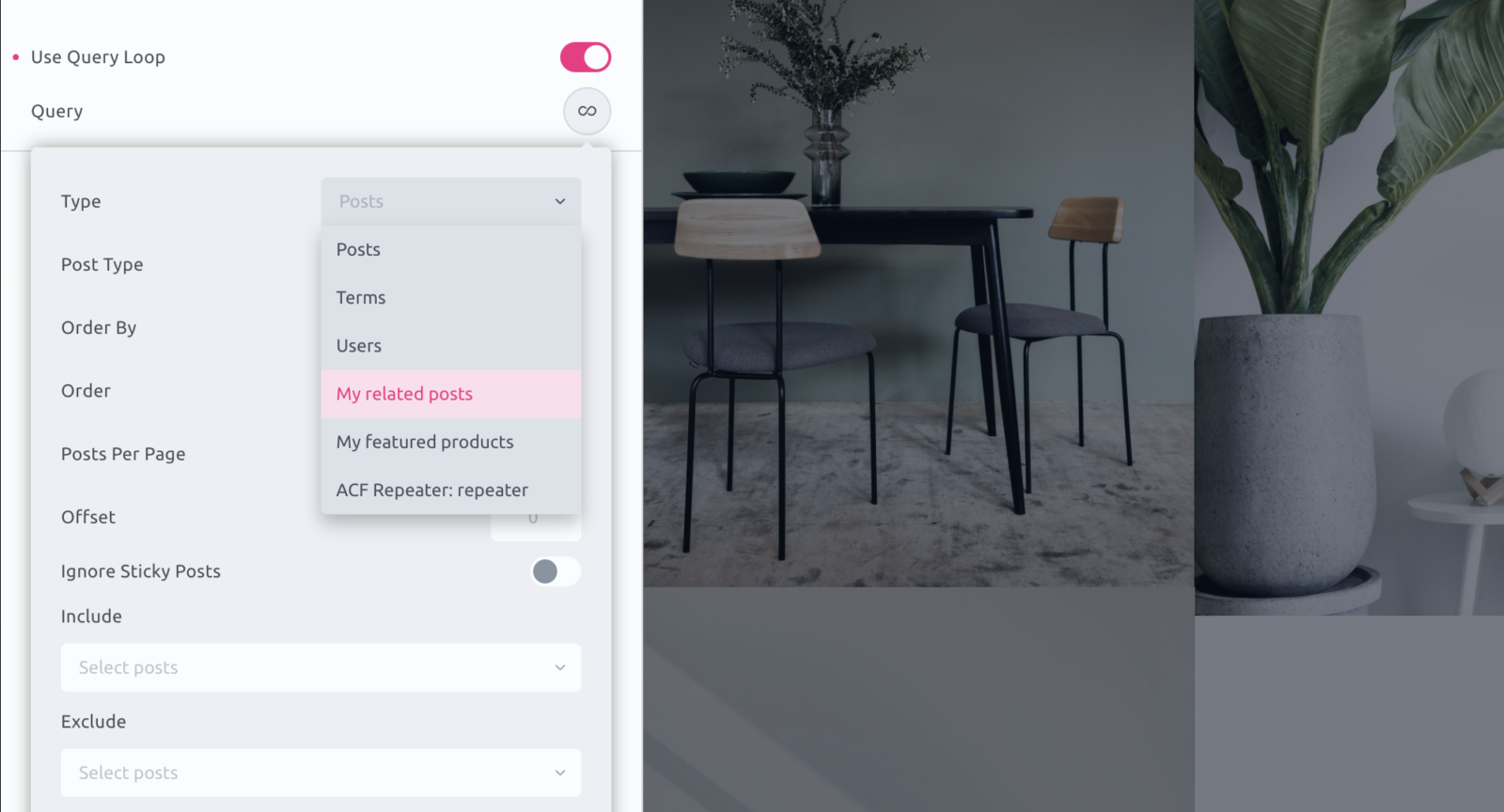 - Adding a new setting in the ‘type’ dropdown of the Query loop control